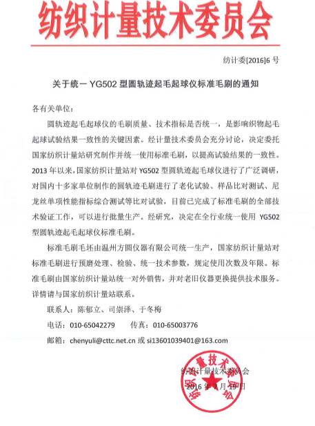 關(guān)于統(tǒng)一YG502型圓軌跡起毛起球儀標(biāo)準(zhǔn)毛刷的通知各有關(guān)單位:圓軌跡起毛起球儀的毛刷質(zhì)量、技術(shù)指標(biāo)是否統(tǒng)一,是影響織物起毛起球試驗結(jié)果一致性的關(guān)鍵因素。經(jīng)計量技術(shù)委員會充分討論,決定委托紡織計量站研究制作并統(tǒng)一使用標(biāo)準(zhǔn)毛刷,以提高試驗結(jié)果的一致性。2013年以來,紡織計量站對YG502型圓軌跡起毛起球儀進行了廣泛調(diào)研,對國內(nèi)十多家單位制作的圓軌跡毛刷進行了老化試驗、樣品比對測試、尼龍絲單項性能指標(biāo)綜合測試等比對試驗,目前已完成了標(biāo)準(zhǔn)毛刷的全部技術(shù)驗證工作,可以進行批量生產(chǎn)。經(jīng)研究,決定在全行業(yè)統(tǒng)一使用YG502型圓軌跡起毛起球儀標(biāo)準(zhǔn)毛刷。 標(biāo)準(zhǔn)毛刷毛坯由溫州方圓儀器有限公司統(tǒng)一生產(chǎn),紡織計量站對標(biāo)準(zhǔn)毛刷進行預(yù)磨處理、檢驗、統(tǒng)一技術(shù)參數(shù),規(guī)定使用次數(shù)及年限。標(biāo)準(zhǔn)毛刷由紡織計量站統(tǒng)一對外銷售,并對老舊儀器提供技術(shù)服務(wù)。